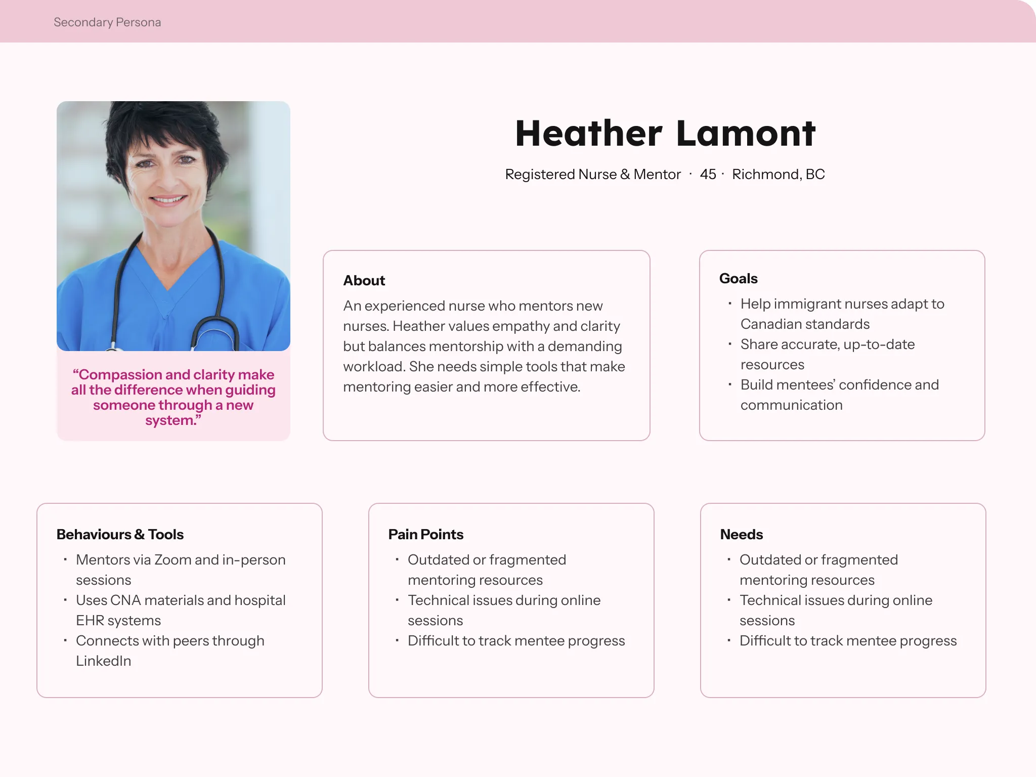 For internationally educated nurses, preparation was already high stress. Any added complexity such as unclear instructions or inconsistent labels raised the barrier further. This made accessibility feel less like a checklist and more like a matter of cultural context: clear, low cognitive load design was what made the product usable at all.